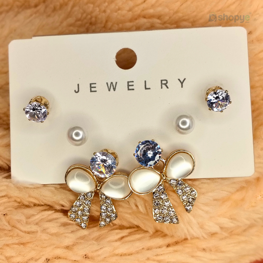 ESHOPYE ™ Pearl Stud & Bow Earrings Set – Elegant 3-in-1 Crystal & Rhinestone Design